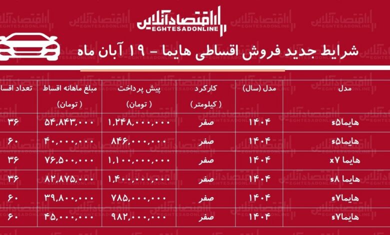 به نقل از خبرگزاری اقتصاد آنلاین، در شرایطی که بازار خودروهای شاسی‌بلند میان‌رده با تقاضای بالایی روبروست، شرکت‌های خودروسازی با ارائه طرح‌های فروش اقساطی متنوع، تلاش می‌کنند تا نیازهای مشتریان را برآورده سازند. در این راستا، جدیدترین طرح‌های فروش اقساطی هایما در آبان‌ماه ۱۴۰۴ توجه بسیاری از خریداران را به خود جلب کرده است. مدل هایما S7 با پیش‌پرداخت ۷۸۵ میلیون تومان و اقساط ۳۹ میلیون و ۸۰۰ هزار تومانی در بازه ۶۰ ماهه، یکی از گزینه‌های جذاب برای علاقه‌مندان به خودروهای شاسی‌بلند محسوب می‌شود. این خودرو با طراحی مدرن و امکانات رفاهی متنوع، همچنان جایگاه ویژه‌ای در بازار حفظ کرده است.