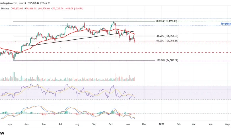 افت بیتکوین به زیر ۱۰۰٬۰۰۰ دلار بهعنوان سیگنالی برای تقویت روند نزولی این رمزارز تلقی میشود. در ابتدای هفته، بیتکوین در مواجهه با سطح ۳۸.۲۰ درصد فیبوناچی در ۱۰۶٬۴۵۳ دلار، که بر اساس موج صعودی از کف ۱۸ فروردین در ۷۴٬۵۰۸ دلار تا سقف تاریخی ۱۴ مهر در ۱۲۶٬۲۹۹ دلار شکل گرفته بود، با مقاومتی قوی روبرو شد. این مقاومت منجر به افت نزدیک به ۶ درصدی در طی چهار روز شد. در لحظه نگارش این گزارش، بیتکوین در محدوده ۹۹٬۳۰۰ دلار نوسان دارد، که نشاندهنده ادامه فشار فروش است.