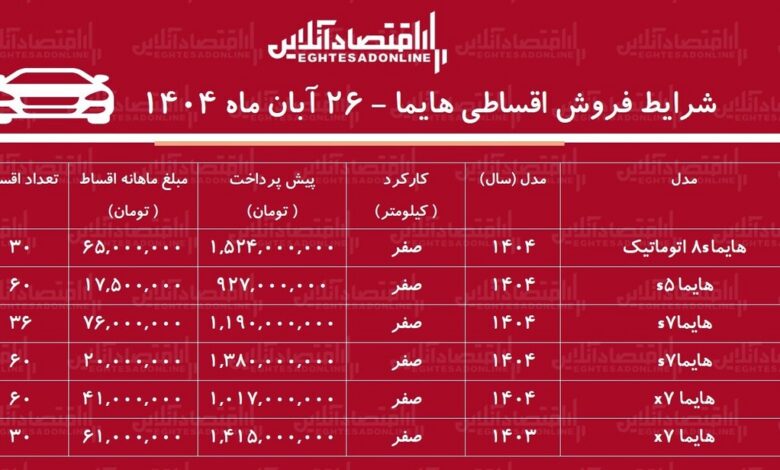 شرایط جدید فروش اقساطی خودروهای هایما برای آبان‌ماه ۱۴۰۴ اعلام شد. مدل‌های مختلف با پیش‌پرداخت و اقساط متنوع ارائه می‌شوند، از جمله هایما ۸S، S۵، ۷X و S۷. این طرح‌ها با توجه به شرایط اقتصادی و نیاز به پرداخت انعطاف‌پذیر، جذابیت زیادی برای خریداران دارند.