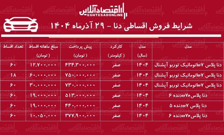 به نقل از خبرگزاری اقتصاد آنلاین، در شرایط کنونی بازار خودرو ایران، طرح‌های فروش اقساطی به‌عنوان راهکاری برای تسهیل خرید خودرو و مدیریت مالی خریداران، توجه بسیاری را به خود جلب کرده‌اند. در این راستا، دنا پلاس اتوماتیک توربو آپشنال با پیش‌پرداخت ۷۵۰ میلیون تومان و اقساط ماهانه ۶۰ میلیون تومان طی ۱۸ قسط ارائه می‌شود. این شرایط به خریداران امکان می‌دهد تا با برنامه‌ریزی مالی دقیق، مالک یکی از محبوب‌ترین خودروهای بازار شوند.