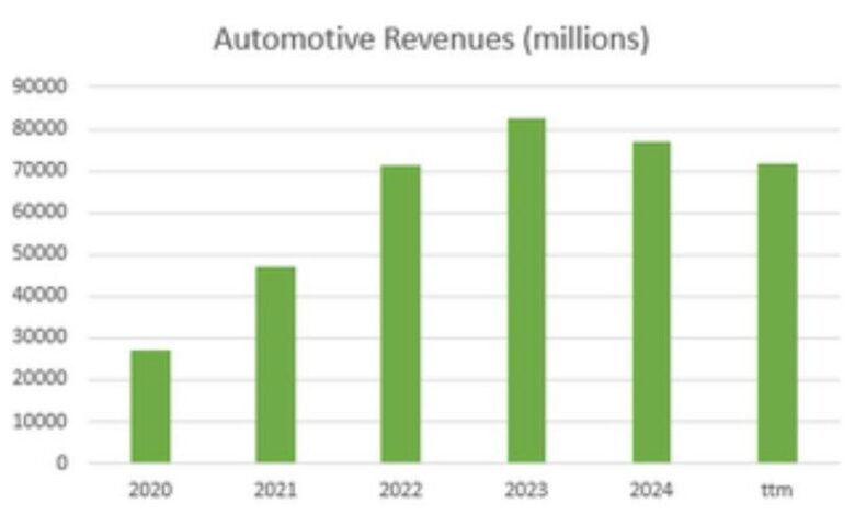 بخش خودرو، که ۸۷ درصد از درآمد تسلا را تشکیل میدهد، با چالشهای بسیاری روبهرو است و پیشبینی میشود که تا سال ۲۰۲۶، برای سومین سال متوالی با کاهش فروش مواجه شود. تحلیلهای مقایسهای نشان میدهند که ارزش هر سهم این بخش تنها ۲۰ دلار است. در مقابل، سرمایهگذاران با امید به آینده و با استناد به پروژههایی نظیر روبوتاکسی، اوکولوس و هوش مصنوعی، به سرمایهگذاری در این سهام ادامه میدهند، هرچند که هیچیک از این طرحها در حال حاضر درآمدی تولید نمیکنند.
