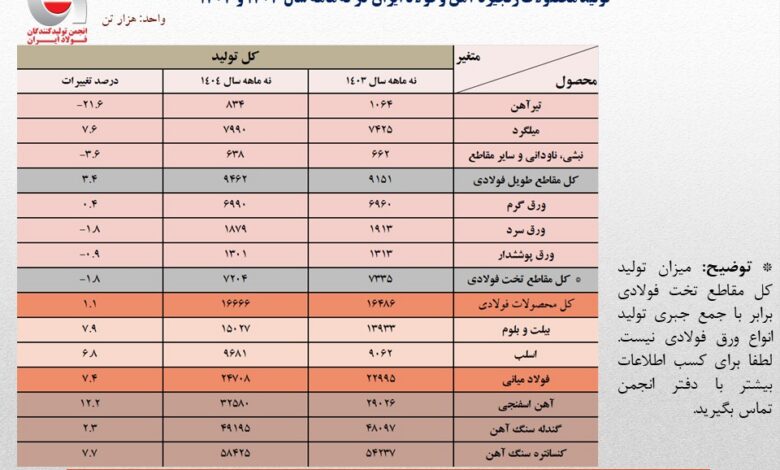 تولید فولاد ایران در ۹ ماهه نخست ۱۴۰۴ با رشد ۷.۴ درصدی و آهن اسفنجی با ۱۲.۲ درصد افزایش یافته است. کاهش تولید تیرآهن و ورقهای فولادی به دلیل تغییرات تولید و رکود بازار، چالشهایی برای صنعت ایجاد کرده است. نیاز به بازنگری در استراتژیها و افزایش ظرفیت تولید مواد اولیه احساس میشود.